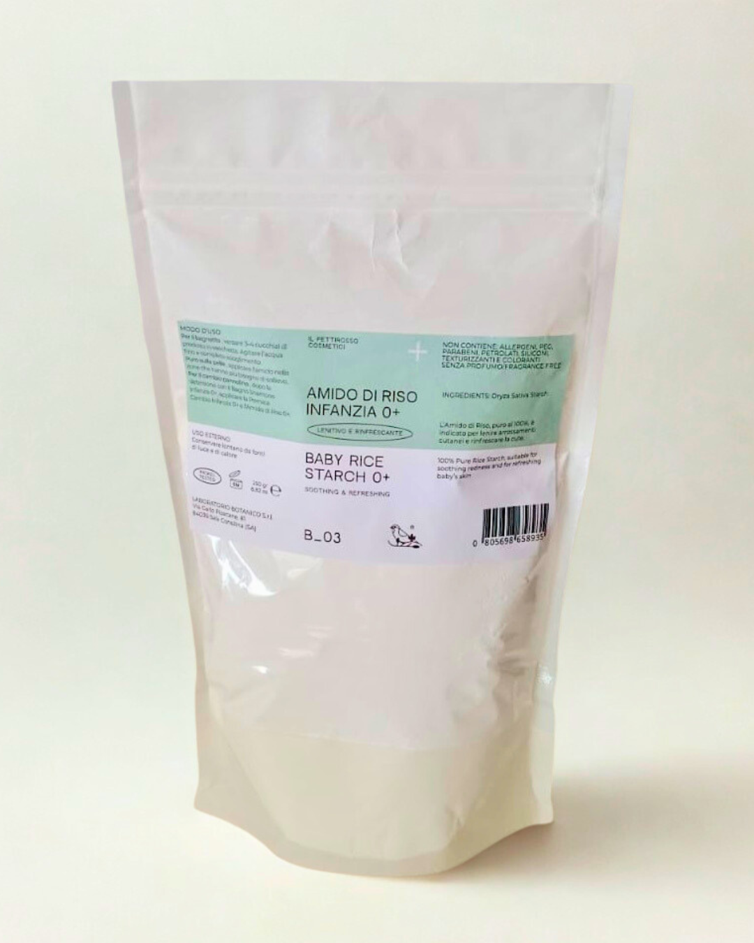 L’Amido di Riso Infanzia 0+ Lenitivo e Rinfrescante Il Pettirosso Cosmetici contiene solo Amido di Riso puro.